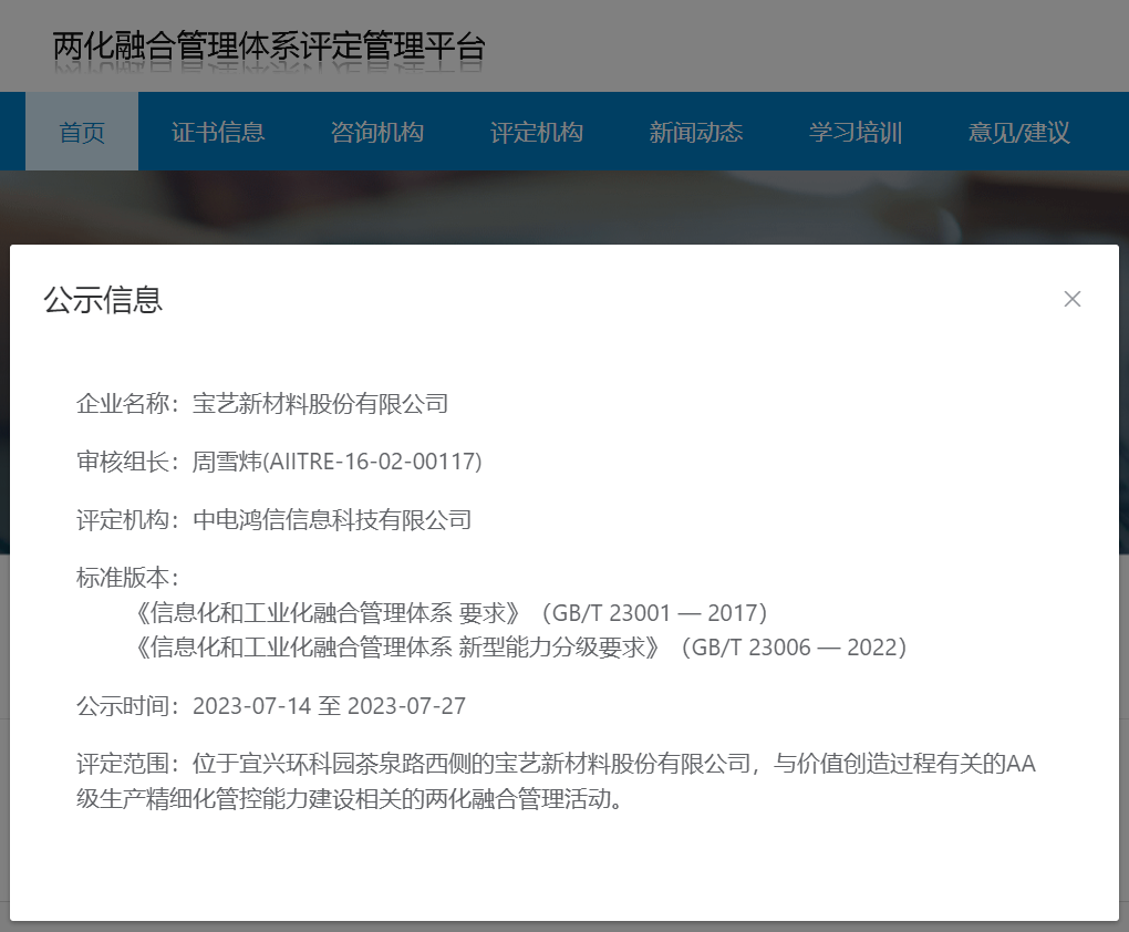 日前,兩化融合管理體系評定管理平臺發(fā)布的公示信息顯示,寶藝新材料股份有限公司(簡稱:寶藝股份 股票代碼:836625)通過兩化融合管理體系A(chǔ)A級評定,進入公示階段。這標志著寶藝股份精益化、規(guī)范化、先進化管理工作取得新突破,綜合化管理工作邁上新臺階。